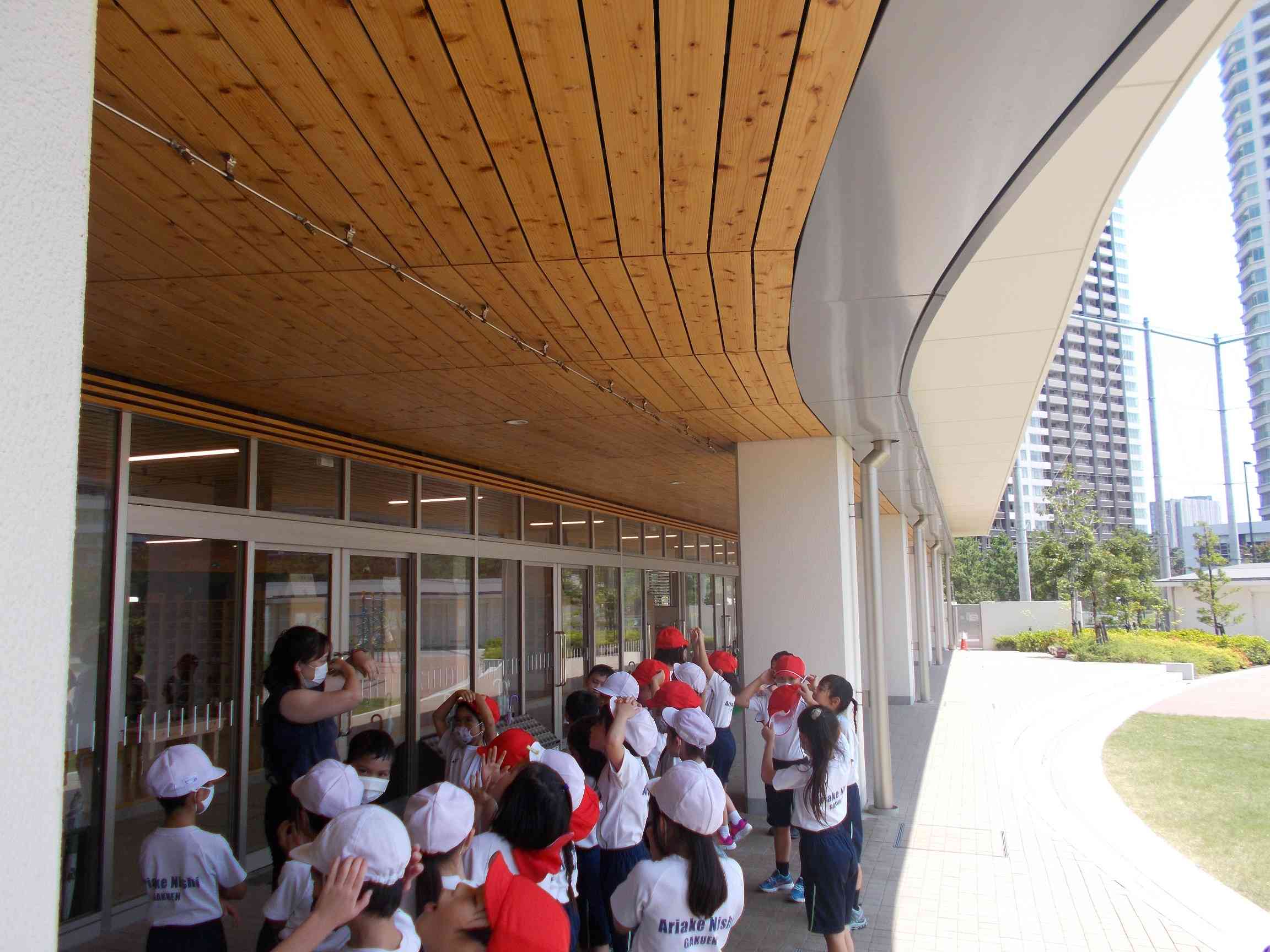 体育の授業では日陰で休憩をとり、水分補給を行っています。また、ミストを出して、気温を下げ、清涼感を演出しています。