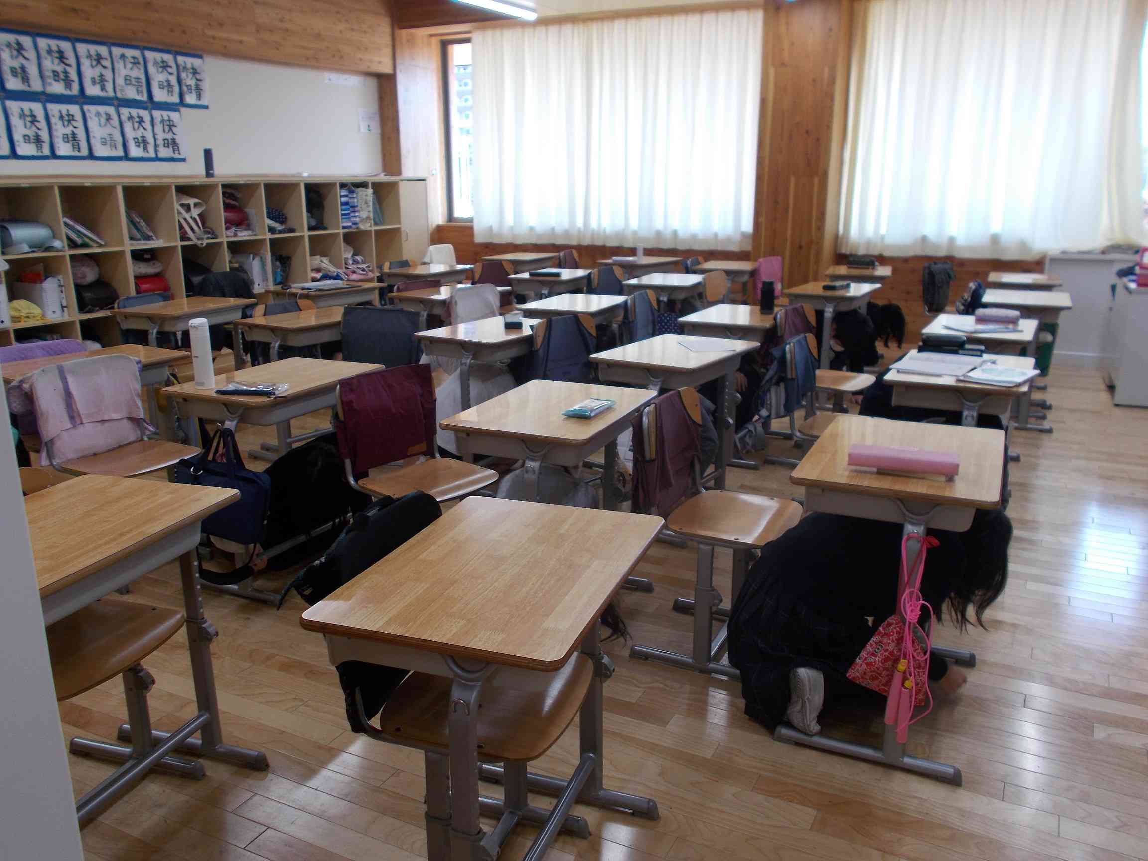シェイクアウト避難訓練を行いました。シェイクアウト避難訓練とは、2008年にアメリカ合衆国で始まった訓練のことで、地震の際の安全確保行動である「命を守る3動作」 を約1分間で、誰でも・どこでも・気軽に・簡単に行うことができる防災訓練のことです。また、「命を守る3動作」とは、(1) 姿勢を低くする。(2)頭・体を守る。(3)揺れが収まるまでじっとしている。という3つの動作のことです。 こどもたちがいる場所で、 臨機応変に対応することになるため、安全確保行動が定着しやすいことが特徴です。 本校でも毎月避難訓練を行っていますが、こどもたちが状況に応じて自ら判断して行動する訓練は今回で2回目です。11月に行った1回目では、事前に訓練内容を知らせての訓練だったので、こどもたちにとっては初めて状況に応じて判断するシェイクアウト訓練となりました。 1枚目の写真は高学年のあるクラスの様子です。訓練の放送が入ると一瞬戸惑いはあったものの、一人一人が素早く机にもぐり、「命を守る3動作」をとっていました。2枚目の写真は低学年のあるクラスの前の廊下の様子です。「地震」の二文字を聞くとすぐにダンゴムシのポーズ(姿勢を低くし、頭・体を守るポーズ)をとり、身を守ることができました。 どの学年も真剣に、素早く身を守る行動をとることができ、大変素晴らしかったと思います。【添付ファイル】