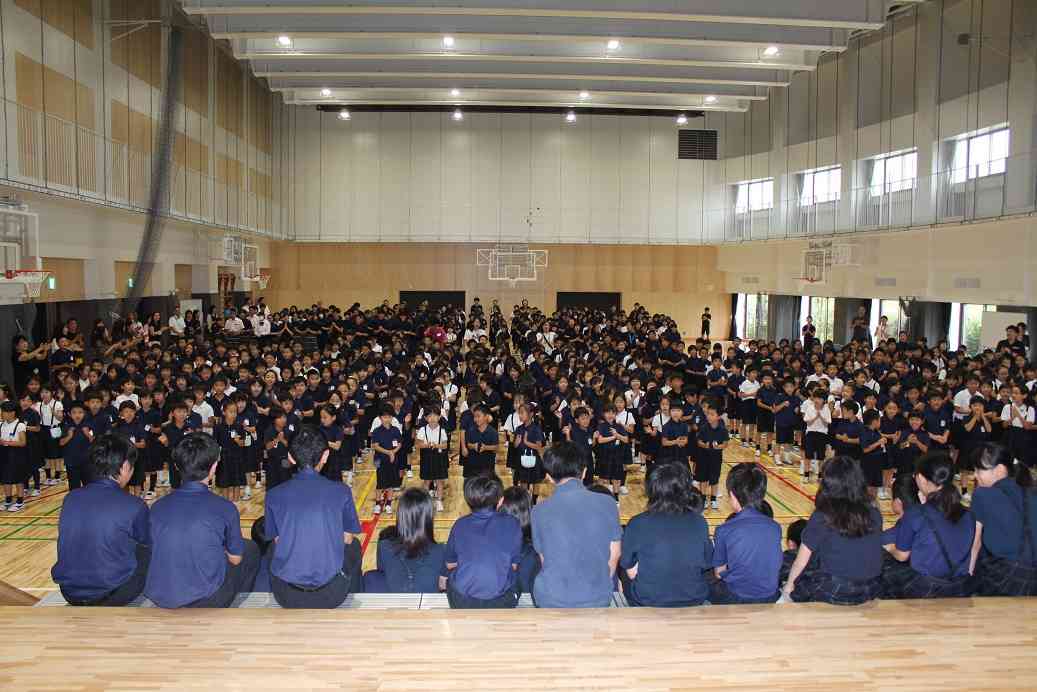 今日は、朝から有明西学園全校児童・生徒が第一体育館で連合水泳記録会(本日・8/29)に出場する6年生、連合水泳大会(9/3)に出場する後期課程の代表生徒を応援する集会を行いました。 有明西学園を代表して出場する選手の皆さんを1年生から9年生までの全員で応援しました。有明西学園らしく、『力いっぱい~Do my best!~』で頑張ってもらいたいと思います。 最後に、5年生が音頭をとって、「フレー!フレー!有西!」「がんばれ!がんばれ!有西!」とエールを送りました。5年生は、集会後に今日の自分たちの応援を振り返り、有明西学園を自分たちも背負っていくぞという気持ちを高め、その後、片付けにも意欲的に取り組んでいました。いいぞ、有西!【添付ファイル】