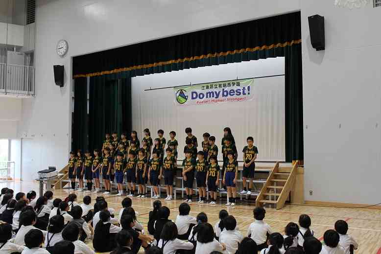 17日に行われる江東区立小学校連合運動会に出場する6年生のための応援集会を行いました。6年生が、出場する種目の紹介とこれまでサポートしてくれた後期課程の先輩方、先生方へのお礼と決意を述べた後、5年生がリードしてみんなでエールを送りました。 7年生から9年生の生徒たちは、自分たちもこうやって応援してもらったことを思い出していたことと思います。自分たちの経験があるからこそ、すすんでサポートをしてくれたのでしょう。6年生の皆さん、有明西学園のみんなで応援していますよ。『力いっぱい~Do my best!~』で頑張りましょう! ※写真は、集会の様子とみんなに支えてもらいながら練習してる様子です。「70」は、有明西学園の連合運動会での学校ナンバーです。ユニフォーム、横断幕も作成しました。【添付ファイル】