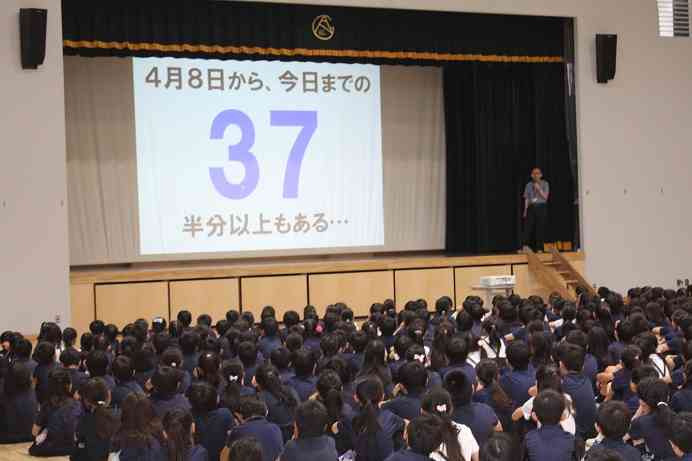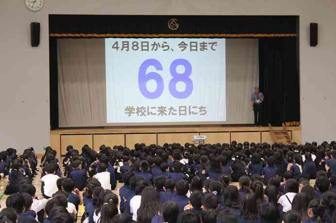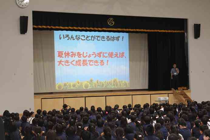 今日は、夏休み前最後のALL朝会がありました。全学園の児童・生徒約800名が体育館に集まり、校長の話を聞きながら、夏休みの過ごし方を考えました。児童・生徒はスライドを見ながら、4月からの68日間を振り返りました。校長からは、1年生から9年生までの4月からの成長について話がありました。 約800名の児童・生徒が、集中して真剣に話を聞く姿に、有明西学園の児童・生徒の素晴らしさを実感しました。37日間の夏休みを「力いっぱい」過ごし、また元気に会えるのを楽しみにしています。みんな元気で、素敵な夏休みを!【添付ファイル】