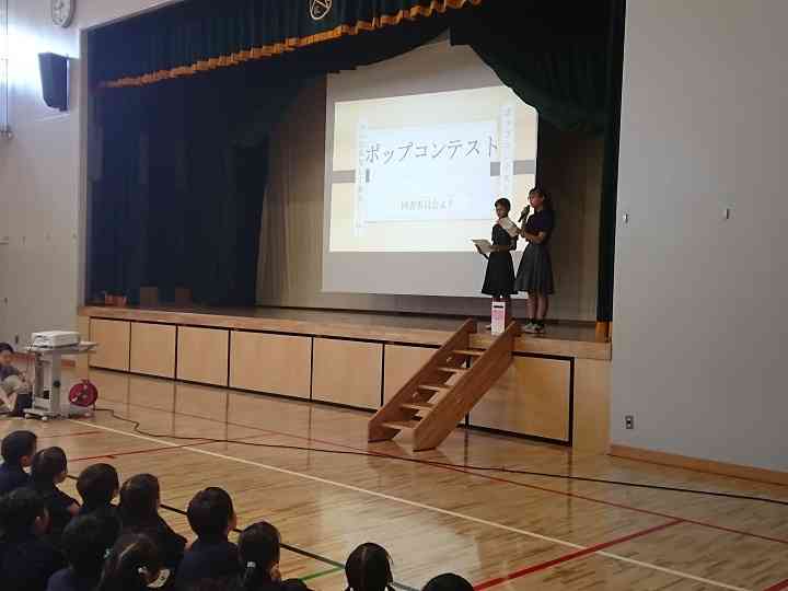 10月25日・26日に行う「Ari-nishi Festival」に向けて、図書委員会がポップコンテストを行います。今朝は、後期課程の図書委員の生徒たちが、前期課程の集会で、ポップコンテストや、その応募方法等について話をしてくれました。 5年生は、国語の授業でポップ作りに取り組んでおり、なかなか素敵なポップが既に廊下に展示してあります。最近は、書店員さんが作るポップが話題になることもよくあります。こどもたちが、どんなポップを作って本の紹介をしてくれるのか楽しみです。【添付ファイル】
