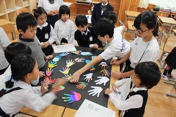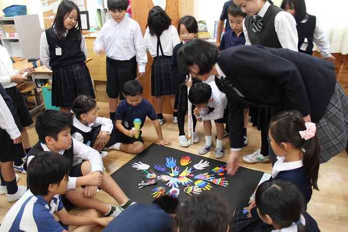 本学園の特色である、1年生から9年生で構成する縦割り班活動「スマイル・プロジェクト」で、定期的に集まり様々な取組をするのが「スマイル・タイム」です。 今回は、今月のAri-nishi Festivalで展示する共同制作に取り組みました。題して「色とりどりにさきほこれ!スマイル花火」です。一人一人が作った手形をどのように並べるか、各班で話し合い、工夫していました。どんな作品になるか、Ari-nishi Festivalにお越しいただき、ご覧ください。【添付ファイル】