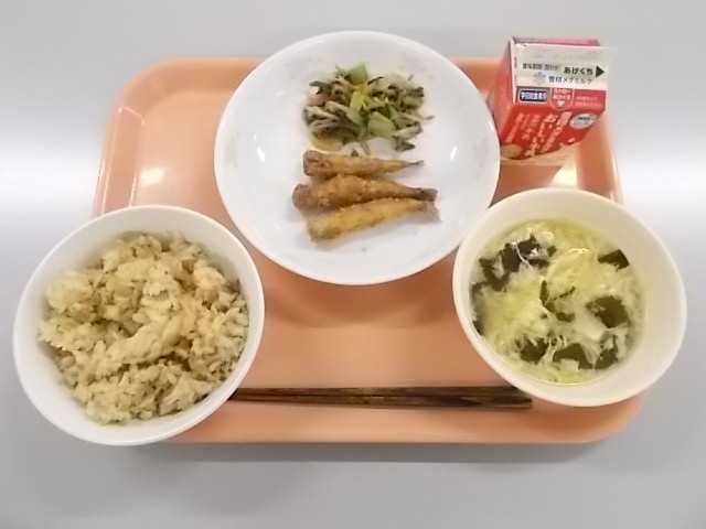 21日(月)たけのこご飯 ししゃもの磯辺揚げ ゆで野菜(土佐じょうゆ)かきたま汁